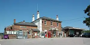 - Station buildings with a Portsmouth-bound train arriving at Platform 2 in the foreground.