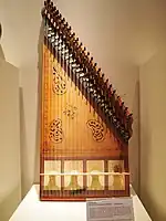 The qanun, kanun, ganoun or kanoon (Arabic: قانون, romanized: qānūn; Armenian: քանոն, romanized: k’anon; Sorani Kurdish: قانون, romanized: qānūn; Greek: κανονάκι, romanized: kanonáki; Hebrew: קָאנוּן, qanun; Persian: قانون, qānūn; Turkish: kanun; Azerbaijani: qanun; Uyghur: قالون, romanized: qalon) is an Arabic string instrument played either solo, or more often as part of an ensemble, in much of the Arab East, and Arab Maghreb region aka North Africa, later it reached West Africa, Central Asia due to Arab migration. It was also common in ancient (and modern-day) Armenia, and Greece. The name derives ultimately from Ancient Greek: κανών kanōn, meaning "rule, law, norm, principle". The qanun traces one of its origins to a stringed Assyrian instrument from the Old Assyrian Empire, specifically from the nineteenth century BC in Mesopotamia.[1] This instrument came inscribed on a box of elephant ivory found in the old Assyrian capital Nimrud (ancient name: Caleh).[1] The instrument is a type of large zither with a thin trapezoidal soundboard that is famous for its unique melodramatic sound.