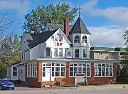In 1893, Ransom B. Shelden Jr. purchased several lots on College Avenue from his father's copper company. By 1896, he had built this Queen Anne house for his family. However, the Sheldens lived in the house only for a short time; in 1898 Ransom Jr. sold the house to John H. Rice and moved to California. Rice was the president of the First National Bank,[4] a founder of Houghton Chamber of Commerce in 1919, and a director of other Upper Peninsula businesses such as the Copper Range Railroad[5] and Ontonogan's Belt Mines.[6] John Rice's family owned the house until 1941. The house was resold several times, and in 1969 the Tau Kappa Epsilon fraternity purchased the home; it has since been used as a fraternity house by students at the nearby Michigan Technological University.