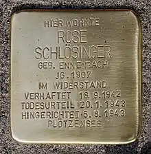 - 1 2 3 "Rose Schlösinger (geb. Ennenbach)". Stolpersteine Berlin (in German). Koordinierungsstelle Stolpersteine Berlin. Retrieved 15 March 2019.