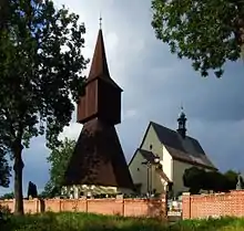 The most valuable building and symbol of the town is a wooden bell tower from 1592. It is unique in shape and construction. It is located next to the Church of Saint John the Baptist. In front of the church there is a statue of King David by Matthias Braun. Due to poor condition, the original from 1738 was replaced by a copy.[7][8]