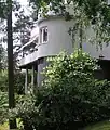 While traditional villas and cottages still dominated house production in the early 1930s, a few exclusive villas were built in the new Functionalist style, inspired by the showcases at the Stockholm International Exhibition 1930. One of the earliest examples is the villa architect Sven Markelius, one of the leader of the exhibition, had built for himself at Nockeby 1930–31. Its strict geometry, its bright plaster façades, and its elevated location with nature left untouched around the building makes it characteristic of villas in Bromma.[1]
