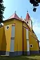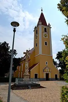The church was built in the 14th century. It is mentioned in a document at the donation of the village in 1333.[1] It was built in Gothic style. It was vaulted in the 17th century, the roof was also repaired. Only the front side remained in Gothic style. Another reconstruction was done in 1922 along with installing new bells. On November 11, 1922, the reconstructed church was consecrated - since then the winter festival is held. A new organ was installed on December 17, 1925, the tower's roof was covered with sheet metal in 1933. The rectory was built in 1787.