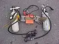 Many of these early sump explorers adopted an approach based upon a sturdy belt, with attached cam-band, that allowed a cylinder to be dropped in and carried alongside the outer thigh. This allowed them to crawl, or wriggle, through the dry cave sections, whilst presenting a secure method of attachment for passing through submerged areas.[9] Swimming efficiency, reduced water resistance, trim and buoyancy control were not generally required due to the nature of those caves. At the time, this approach to 'wet' cave exploration was generally called the 'English System'.[17]