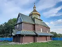 It was built of wooden logs. According to legend, it was originally a church in Skala-Podilska, then it was brought to the village of Tsyhany.[2] It was under the protection of Saint Nicholas the Wonderworker. In 1895, the Ukrainian prominent poet Ivan Franko read the liturgical book "Apostol" in the church and sang with the choir.[3][4] When a new stone church was consecrated in 1905 in Tsyhany, it was dismantled and moved to Dubivka. The main patron of the church was Semen Velychko. He donated land for the church and made a significant financial contribution. Therefore, on 14 September 1909, after the construction was completed, it was consecrated on the feast of Saint Simeon the Pillar as a thank you to the benefactor.[2]