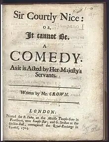 Sir Courtly Nice: Or, It Cannot Be is a 1685 comedy play by the English writer John Crowne. Rehearsals by the United Company were underway when the death of Charles II in February led to the closure of all theatres as a mark of respect. The play was eventually staged on 9 May at the Theatre Royal, Drury Lane.[1] It is the tradition of the Restoration Comedy.[2] A popular hit it became a stock part of the repertoire for more than a century, with Colley Cibber and Anne Oldfield appearing in a celebrated 1709 revival.