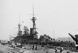 Brazil's Minas Geraes, the lead ship, was laid down by Armstrong on 17 April 1907, while its sister São Paulo followed on 30 April at Vickers. Completion of the partial hull needed to launch Minas Geraes was delayed by a five-month strike to 10 September 1908. São Paulo followed on 19 April 1909.[85] Both were christened in front of large crowds by the wife of Francisco Régis de Oliveira, the Brazilian ambassador to the United Kingdom.[86] After fitting-out, the period after a warship's launch where it is completed, Minas Geraes was put through multiple trials of the speed, endurance, efficiency, and weaponry of the ship in September, including what was at that time the heaviest broadside ever fired off a warship. Minas Geraes was completed and handed over to Brazil on 5 January 1910.[87] The trials proved that the blast from the class' superfiring upper turrets would not injure crewmen in the lower turrets. The ship itself managed to reach 21.432 knots (24.664 mph; 39.692 km/h) on an indicated horsepower (ihp) of 27,212.[88] São Paulo followed its classmate in July, after its own trials at the end of May, where the ship reached 21.623 knots (24.883 mph; 40.046 km/h) at 28,645 ihp.[89]