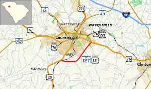 SC 127 begins at an intersection with US 221 (Greenwood Road). This is also the southern terminus of US 221 Truck south of Laurens within Laurens. The highways travel to the east and cross over Burnt Mill Creek. They curve to the northeast and have an interchange with South Harper Street Extension. After crossing the Little River, they meet US 76 (East Main Street); this intersection also marks the eastern terminus of US 76 Business. SC 127 ends here though US 76 and US 221 Truck continue to travel to the northwest of the city's downtown area.[2]