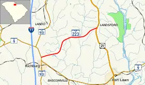 SC 223 is a two-lane rural highway that traverses from SC 9 and SC 901 north of Richburg to U.S. Route 21 (US 21) in the community of Landsford and Landsford Canal State Park.[2][3]