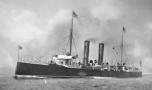 The station suffered significant ship reductions between 1869 and 1874.[5] From 1870 it was commanded by a captain, designated the "senior officer",[6] and comprised just three gunboats[7] although it had responsibility for the Western Atlantic from Brazil South.[8] The squadron's only permanent base was a coal station at Stanley on the Falkland Islands.[9] It was disbanded altogether in 1905.[10] Its area of operation, along with that of the Pacific Station, was ultimately absorbed into that of the North America and West Indies Station, with its main base at the Royal Naval Dockyard, Bermuda, which was redesignated the America and West Indies Station.[11]