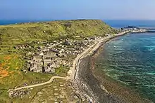 South Penghu Marine National Park is between 23°14' and 23°17' N, and between 119°30' and 119°40' E.[1] It is in Wangan Township.[7] Its total area is about 358.44 km2, with 354.73 km2 of water and 3.70 km2 of land.[9] The islands have basalt landforms, including columnar basalt. There are abandoned houses and a few temples on the islands.[7] There are also walls built of stone, called "cai zhai", that were used to protect vegetables from strong winds. There is a lighthouse on Dongjiyu.[5] The "Blue Cave" is a sea cave on Xijiyu.[7]