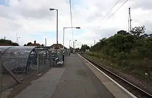 The line and station were opened on 1 June 1889 for goods and on 1 October 1889 for passenger services by the Great Eastern Railway.[1] The station was originally named Woodham Ferris; this was changed to Woodham Ferrers on 1 October 1913, and to South Woodham Ferrers on 20 May 2007.[1] The station had two platforms connected by a footbridge; a goods yard; and a 36-lever signal box. The goods yard closed in 1964. The south platform, goods loop, footbridge and signal box were decommissioned on 21 January 1967. The level crossing immediately to the east of the station was converted to automatic-opening on 9 March 1986 and to automatic half-barriers on 4 April 1993.[1] Electrification of the Wickford to Southminster line using 25 kV overhead line electrification (OLE) was completed on 12 May 1986.