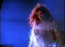 This video is among the least appreciated by critics, partly due to its perceived lack of respect towards the Holocaust, as Farmer stands in suggestive positions, and her clothes are almost transparent. According to author Erwan Chuberre, the video "was made somewhat in haste and with modest means".[1] French magazine Instant-Mag said about the video: "The quality, good taste and value of this short film are frankly debatable. Not only it doesn't contribute towards the work, but moreover, it has a certain vibe that it was shot in a hurry, with a cock-and-bull accumulation of colorful images, which also have very little to do with the theme of the song. The gap is rather embarrassing, even oppressive, and some people find it downright insulting and inappropriate".[14] Farmer's position on a sofa, elbows resting on knees and head bowed as to protect herself from fire at the very end of the video, would be inspired by the text Le Brasier, written by French poet Guillaume Apollinaire,[15] in which it can be read: "Et pour toujours je suis assis dans un fauteuil (...) / Les flammes ont poussé sur moi comme des feuilles."("And for ever I'm sitting in an armchair (...) / The flames pushed on me like leaves.")[16]
