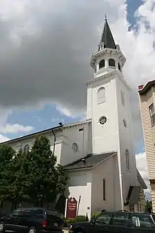 St. John's Church was extensively renovated in 1870. Originally, the sanctuary was two stories in height with galleries. During the renovations, the church was completely divided into two stories, with sunday school rooms on the first floor and the sanctuary on the second. To access the second-floor sanctuary, two staircases were built, one on either side of the bell tower. The church was again renovated in 1900 when the former lecture hall which stood next to the church was raised in order to extend the chancel of the church. This addition exhibits Romanesque characteristics, differing from the late-Georgian appearance of the older sections of the building. In the first decade of the twentieth century, further improvements included the addition of four Tiffany stained glass windows, including the "Rabboni" window over the altar, and the installation of two large mosaic panels in the apse of the chancel, depicting the Annunciation, the Nativity, the Crucifixion, and the Ascension.[4] A separate sunday school building was constructed on the church campus in 1921. In 1969, a lightning bolt struck the bell tower, igniting a fire which destroyed the room and ceiling over the church. Rebuilding commenced and was completed within a year to celebrate the two hundredth anniversary of the church's organization.[5]