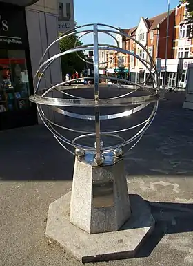![]() The Millennium Dial armillary in its latest location outside the town's Waterstones bookshop | |
