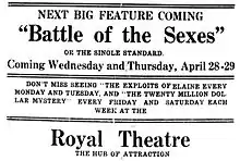 The Battle of the Sexes was the second D. W. Griffith feature to be released to the public, following Biograph's long-delayed release of Griffith's first feature, Judith of Bethulia, by barely more than a month. He had already begun The Escape (1914), but production had been stopped when actress Blanche Sweet fell sick with scarlet fever, and the Reliance-Majestic Studio was already in trouble and in need of a viable Griffith property, fast.[4] Griffith decided on a scenario entitled "The Single Standard", written by in-house screenwriter Daniel Carson Goodman and filmed at the Reliance studio in New York City, rather than at the Hollywood studio, which was still being built. According to Lillian Gish, The Battle of the Sexes was shot in only five days.[5] Although the film was complete by February, its release was delayed for two further months. Several reasons have been advanced for the impasse, but scholar Paul Spehr has suggested that both Reliance-Majestic and its distributor, Mutual, were having difficulty developing an effective distribution strategy for longer, multi-reel films in a market still dominated by one- and two-reel subjects.[6] The Battle of the Sexes was premiered at Weber's Theater in New York City on April 12, 1914, and was a considerable success, the first Griffith enjoyed with his name over the title.