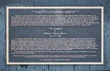 Paul Knauls, a local resident and entrepreneur who was described as the "unofficial mayor" of Northeast Portland,[8] was "instrumental" in securing funding for the sculpture's design.[9] Cheryl Perrin and Betsy Brumm coordinated fundraising, with assistance from Charles Lewis; before Lewis invited U.S. Senator Mark Hatfield, for whom he had worked as an intern, to speak at a breakfast fundraiser, fundraising efforts had stalled for eight years. Oregon's Congressional delegation wrote appeals to large companies, requesting their support at the breakfast. Within six months of the campaign's re-launch, $300,000 was raised, enough to create the sculpture.[10] The Dream was dedicated by the Martin Luther King, Jr. Statue Foundation on August 28, 1998, the 35th anniversary of King's "I Have a Dream" speech.[6][11] It was also dedicated by Harry Belafonte and much of the Congressional delegation.[10] John Jenkins, chairman of the foundation, said in a statement announcing the statue and its dedication: