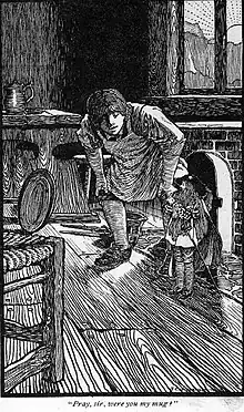 The King of the Golden River or The Black Brothers: A Legend of Stiria is a fantasy story originally written in 1841 by John Ruskin for the twelve-year-old Effie (Euphemia) Gray, whom Ruskin later married.[1] It was published in book form in 1851, and became an early Victorian classic which sold out three editions. In the "Advertisement to the First Edition", which prefaces it, it is called a fairy tale, one, it might be added, that illustrates the triumph of love, kindness, and goodness over evil; however, it could also be characterised as a fable, a fabricated origin myth and a parable. It was illustrated with 22 illustrations by Richard Doyle (1824–1883).[2] A later edition was illustrated by Arthur Rackham in 1932.