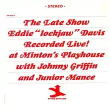 The Late Show is a live album by saxophonists Eddie "Lockjaw" Davis and Johnny Griffin recorded at Minton's Playhouse in 1961 and released on the Prestige label in 1965.[3] The album was the fourth release from the recordings at Minton's after The Tenor Scene, The First Set and The Midnight Show.