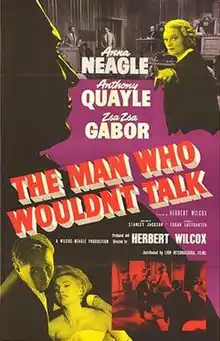 The Man Who Wouldn't Talk is a 1958 British drama film directed by Herbert Wilcox. It starred Anna Neagle, Anthony Quayle, Zsa Zsa Gabor, Dora Bryan, John Le Mesurier and Lloyd Lamble.[2]