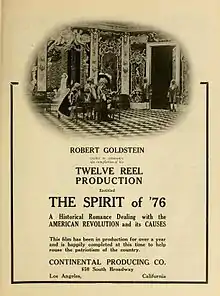 The film was produced by Los Angeles-based costume supplier and movie producer Robert Goldstein, who was born in California to German-Jewish parents. Goldstein outfitted the cast of D. W. Griffith's 1915 silent epic The Birth of a Nation, and was reportedly inspired by Griffith's film to produce a movie about the American Revolution.[1] Griffith initially encouraged Goldstein's idea and cooperated with him, but later distanced himself from that project in favor of pursuing his own treatment of the subject, the 1924 film America.[2] The film's script contained several historical inaccuracies, including an assault on Benjamin Franklin by George III and a sexual relationship between George and Catherine Montour — possibly based on his supposed (and equally fictitious) relationship with Hannah Lightfoot.[2]