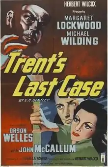 Trent's Last Case is a 1952 British detective film directed by Herbert Wilcox and starring Michael Wilding, Margaret Lockwood, Orson Welles and John McCallum.[2] It was produced by Wilcox as part of a distribution agreement with Republic Pictures. It was based on the 1913 novel Trent's Last Case by E. C. Bentley, and had been filmed previously in the UK with Clive Brook in 1920, and in a 1929 US version.[3][4]