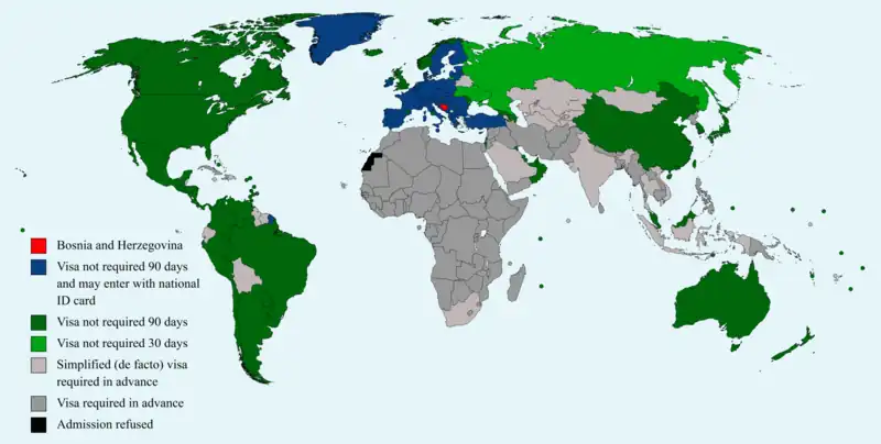 Valid multiple entry visa holders and residents of the European Union, Schengen Area member states, and United States of America can enter Bosnia and Herzegovina without a visa for a maximum stay of 30 days.[4][5] This is not applicable to holders of Kosovan passport.[6]