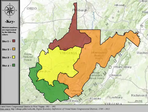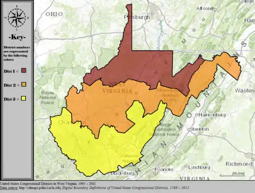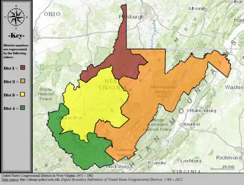 Table of United States congressional district boundary maps in the State of West Virginia, presented chronologically.[3] All redistricting events that took place in West Virginia between 1973 and 2013 are shown.