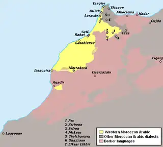 ![]() Map showing Western Moroccan Arabic speaking areas (yellow) |