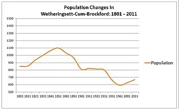 The population of Wetheringsett-cum-Brockford was at 851 in 1801 and then rose to a peak of 1,101 in 1851. After 1851, the population steadily decreased to 669 in 2011. However, there was a peak in the population decline in 1911 with a population of 822, and in 1951 with a population of 665.[9][10]