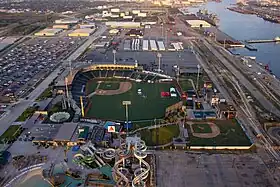 The park, which opened in 2005, is located on what used to be old cotton warehouses on the city's waterfront.[5] Naming rights were paid for by Whataburger, Inc., which was headquartered in Corpus Christi before relocating to San Antonio in 2009. The USS Lexington and the Texas State Aquarium are visible from inside the park.[10] As of 2019, Whataburger Field features 5,679 fixed seats, 19 luxury suites and two outfield berm areas that are able to accommodate approximately 2,000 people.[10]