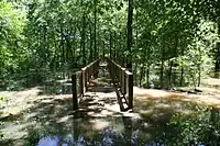 A boardwalk, here flooded, and trails give access to refuge lands to hikers and bird watchers.