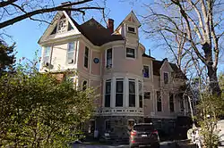 Wildwood is a historic house at 808 Park Avenue in Hot Springs, Arkansas. It is a somewhat rambling 2+1⁄2-story wood-frame structure, with a variety of projecting sections, gables, and porches typical of the late Victorian Queen Anne period. Notable features include a round corner turret, steeply pitched roofs, and a variety of exterior sheathing. The interior is as ornate and elaborate as the exterior, with well-preserved woodwork from different types of hardwood in each downstairs room. The house was designed by Phillip Van Patten and built in 1884 for his brother-in-law, Dr. Harvey Prosper Ellsworth.[2] The house is now a bed and breakfast inn.