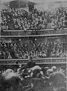 Thompson's campaign held their election night victory party in the Louis XIV Ballroom of the Sherman House Hotel.[83] Both Thompson and Dever's campaign headquarters had been located in the Sherman House Hotel, with Thompson's headquarters being located one floor above Dever's.[2][84] Many Thompson supporters celebrated in the streets of the city's downtown.[85] Many Thompson supporters celebratorily drove around the city carrying brooms.[2] In his victory statement, Thompson reafirmed his support for his America First platform, and pledged to use his office to improve the city of Chicago's port, declaring, "I pledge my vote and support for America First, a greater Chicago, and a deep waterway." Thompson also declared the he would, "do away with the breadline by stimulating business," and also promised to oust Superintendent McAndrew.[85] Thompson's victory speech emphasized the anti-British themes of his campaign, declaring,