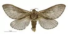 The wingspan is 34–40 mm for males and 43–52 mm for females. The colour of the forewings varies from dark to pale brown. The hindwings are pallid to infuscate.[7] W. copularis has variable wing patternation and is visually very similar to four other species within the genus Wiseana.[8][9] It is possible to distinguish the male of W. copularis by the long rectangular antennal pectinations of the adult moth.[7] However the recommended technique to distinguish specimens down to species level is through microscopic examination of the genitalia of the species or alternatively mitochondrial DNA analysis.[8][9]