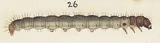 Adult porina moths mate as soon as they emerge from the soil after completing the larval stage.[4] The moths fly in spring, summer, and early autumn depending on location.[4] The moths do not feed and only live a few days. During these few days, the female moth flies over pastures and releases around 3000 eggs. Her eggs will hatch within a few weeks.[4] At first the newly hatched caterpillars will live above ground. They spend about 5 weeks on top of the soil feeding on plant matter and microflora.[4] As the caterpillars grow larger, they burrow beneath the soil and construct permanent silk burrows which can reach a depth of around 30cm.[7] They will emerge from these burrows at night to feed. They sever grass and clover leaves at the base of the plant and drag them back to their burrow to consume.[4] Porina caterpillars will moult seven or eight times over their lifetime. Development from egg to adult takes 12 months.[4]