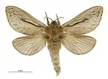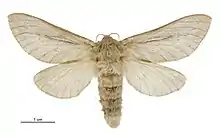 The wingspan is 38–50 mm for males and 49–66 mm for females. Forewing colour varies, but is usually fawn, pinkish fawn or infuscate. The hindwings are pinkish-fawn to yellow-fawn.[4] Adults are on wing from September to April.[5] Adult male and female bog porina can be told apart as the males are much darker in colour and have noticeable dark spots on their forewings. The females are lighter in colour with brown dots on their forewings. Caterpillars of W. umbraculata have a brown head with a dirty white and grey body.[4] Without DNA technology, it is not possible to tell the different species of porina apart at the larval/caterpillar stage.[2]