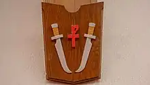 The first shield we will examine is found as you first enter the nave looking up at the trusses on the left side. We will then work our way forward from the choir loft towards the pulpit area. The first shield depicts Two Keys and represents Simon Peter, Andrew's Brother, called Peter by Jesus of Nazareth. Traditionally, St. Peter is represented holding Two Keys of equal size, which is explained by the Savior in the Gospel of Matthew: “And I will give unto thee the keys of the kingdom of heaven: and whatsoever thou shalt bind on earth shall be bound in heaven: and whatsoever thou shalt loose on earth shall be loosed in heaven” (Matthew 16:19).