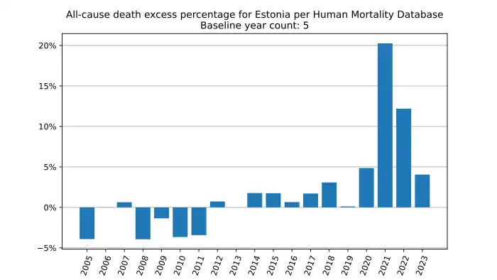 All-cause death excess percentage in Estonia, year by year, based on mortality.org data, stmf.csv: