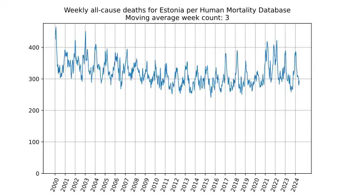 Weekly all-cause deaths in Estonia, based on mortality.org data, stmf.csv, 3-week moving average: