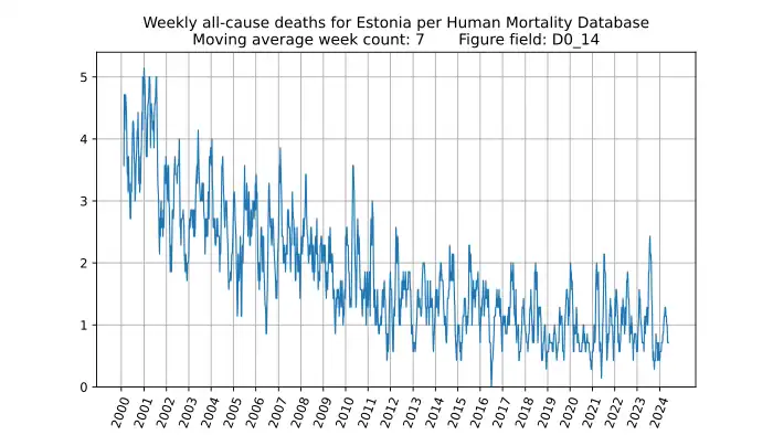 Weekly all-cause deaths in Estonia for 0-14 year olds, based on mortality.org data, stmf.csv, 7-week moving average: